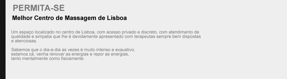 No Permita-se | Massage Lisboa, encontrará um spa e centro de massagens que o farão sentir de uma forma diferente e ir mais além. Sensações de prazer infinito que lentamente irão inundar o seu corpo com emoções que o levarão a um relaxamento físico e mental únicos.